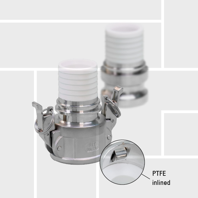 Camlock is now available with molded PTFE to fit inside the coupling and bonded mechanically. That is applied on stainless steel camlock as in the chart.